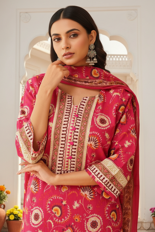 View full detailsHot Pink Garden Jaipur Cotton Kurti With Pant And Dupatta Set. Pure Versatile Cotton. | Laces and Frills