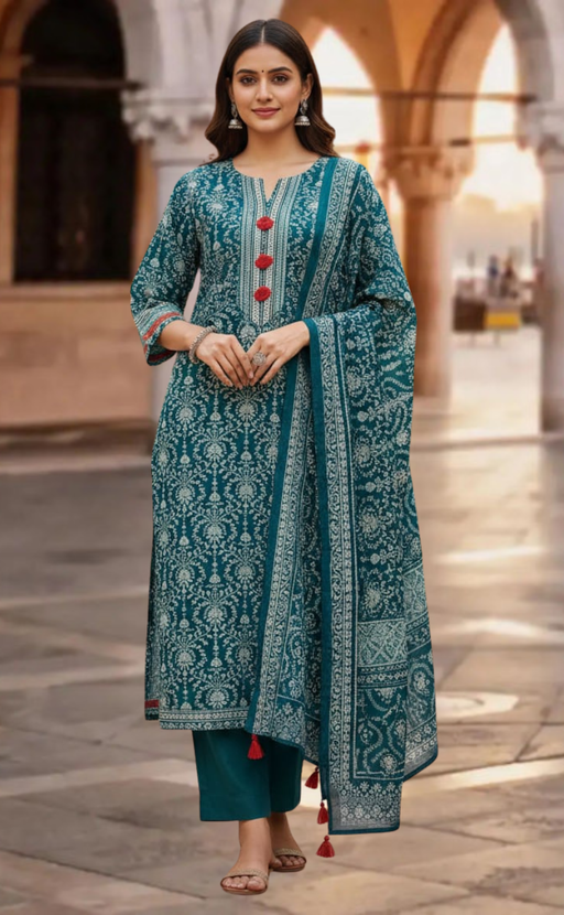 View full detailsTeal Green Garden Jaipur Cotton Kurti With Pant And Dupatta Set. Pure Versatile Cotton. | Laces and Frills