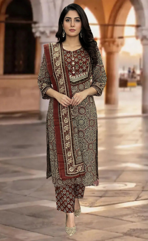 View full detailsDark Maroon Ajrakh Jaipur Cotton Kurti With Pant And Dupatta Set. Pure Versatile Cotton. | Laces and Frills