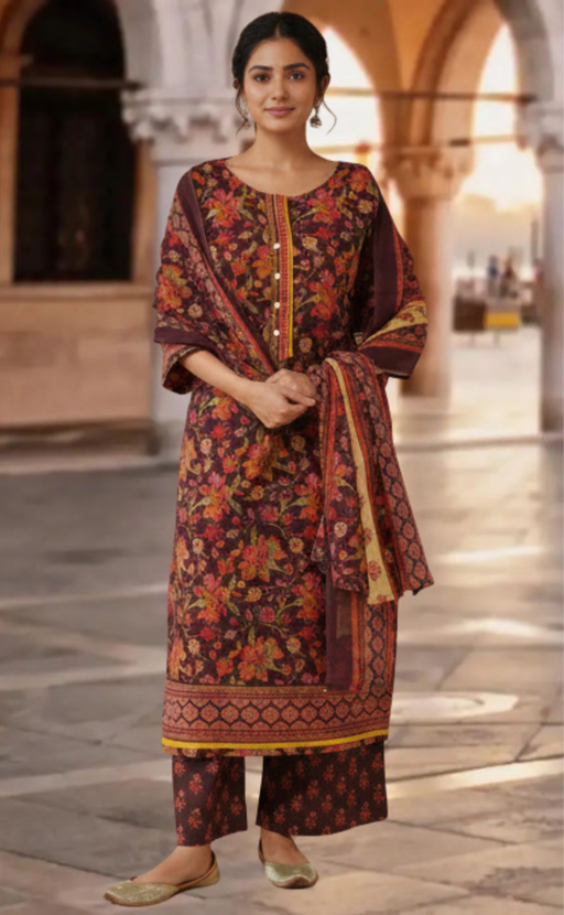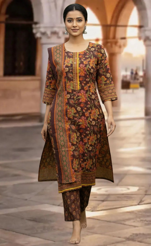 View full detailsDeep Brown Floral Jaipur Cotton Kurti With Pant And Dupatta Set. Pure Versatile Cotton. | Laces and Frills