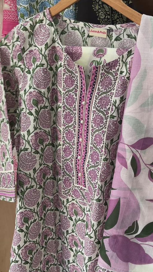 View full detailsViolet Floral Jaipur Cotton Kurti With Pant And Dupatta Set. Pure Versatile Cotton. | Laces and Frills