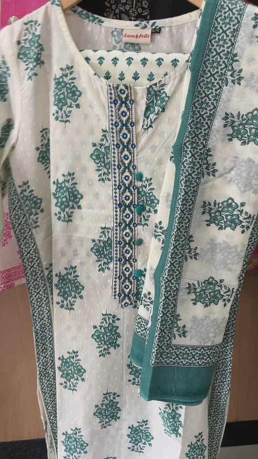 View full detailsSea Green Garden Jaipur Cotton Kurti With Pant And Dupatta Set. Pure Versatile Cotton. | Laces and Frills
