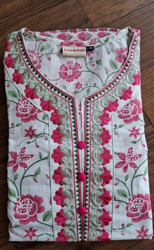 View full detailsPink Garden Jaipur Cotton Kurti With Pant And Dupatta Set. Pure Versatile Cotton. | Laces and Frills