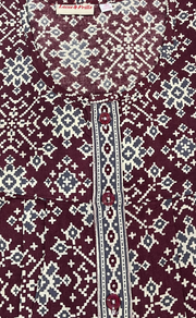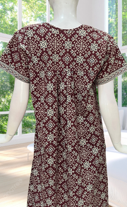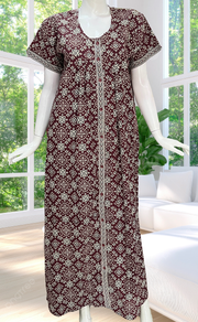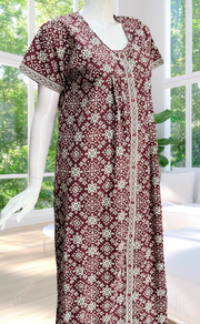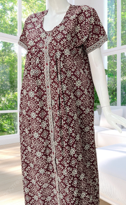 Maroon Ethnic Print Full Open Pure Cotton Nighty. Pure Cotton | Laces and Frills