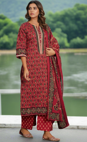 Maroon Ikkat Jaipur Cotton Kurti With Pant And Dupatta Set. Pure Versatile Cotton. | Laces and Frills