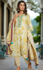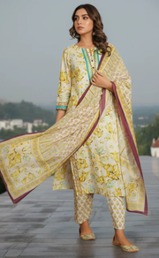 Off White/Yellow/Sea Green Jaipur Cotton Kurti With Pant And Dupatta Set. Pure Versatile Cotton. | Laces and Frills