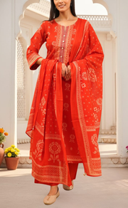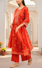 Rust Orange Floral Jaipur Cotton Kurti With Pant And Dupatta Set. Pure Versatile Cotton. | Laces and Frills