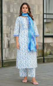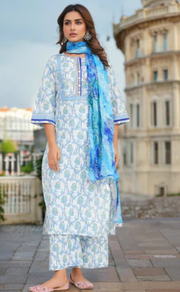 White/Blue Floral Jaipur Cotton Kurti With Pant And Dupatta Set. Pure Versatile Cotton. | Laces and Frills