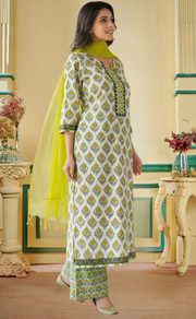 White Floral Jaipur Cotton Kurti With Pant And Dupatta Set. Pure Versatile Cotton. | Laces and Frills