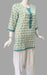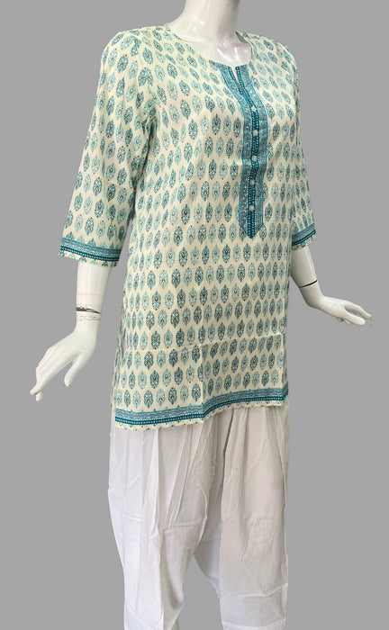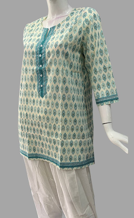 White/Sea Green Motif Jaipuri Cotton Short Kurti. Pure Versatile Cotton. | Laces and Frills