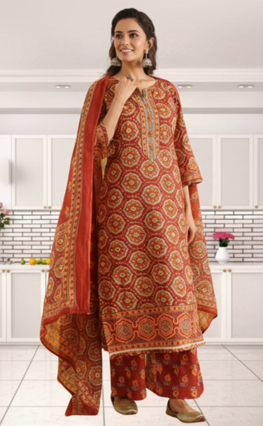 View full detailsBeige/Maroon Ajrakh Print Cotton Kurti With Pant And Dupatta Set. Pure Versatile Cotton. | Laces and Frills
