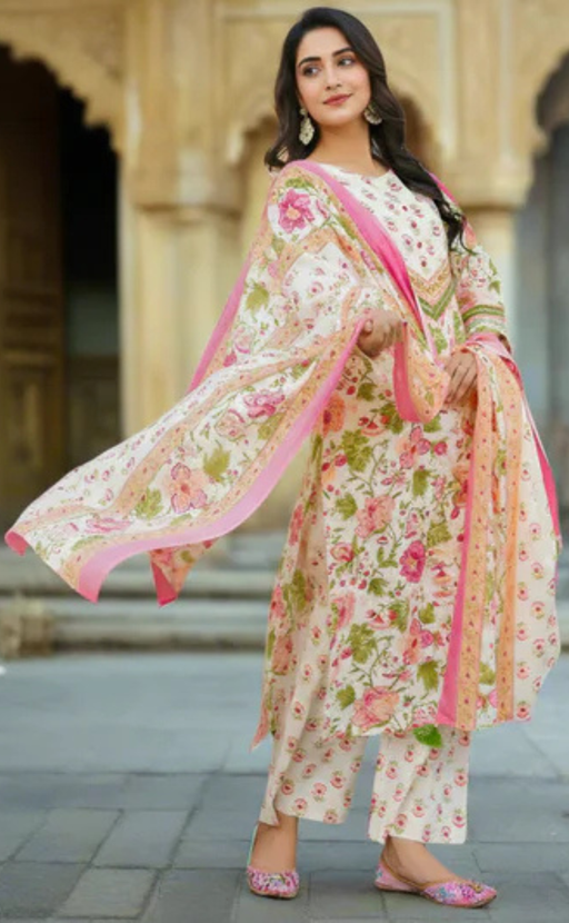 View full detailsOff White/Pink Floral Jaipur Cotton Kurti With Pant And Dupatta Set.Pure Versatile Cotton. | Laces and Frills