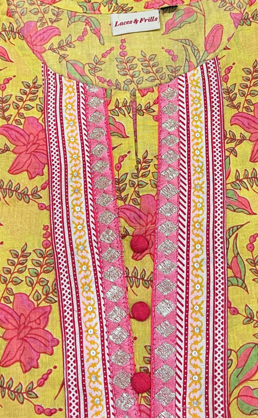 View full detailsYellow/Pink Floral Jaipur Cotton Kurti With Pant And Dupatta Set .Pure Versatile Cotton. | Laces and Frills