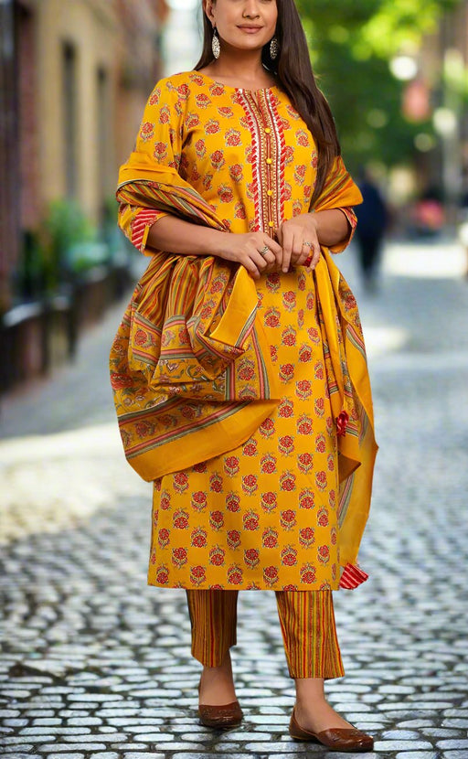 View full detailsYellow Floral Jaipur Cotton Kurti With Pant And Dupatta Set .Pure Versatile Cotton. | Laces and Frills