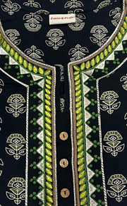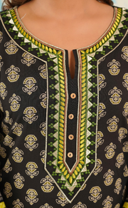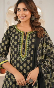 Black Tiny Flora Jaipur Cotton Kurti With Pant And Dupatta Set. Pure Versatile Cotton. | Laces and Frills