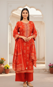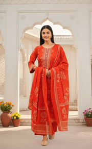 Rust Orange Floral Jaipur Cotton Kurti With Pant And Dupatta Set. Pure Versatile Cotton. | Laces and Frills