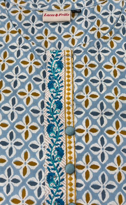 Light Blue Flora Jaipur Cotton Short Kurti. Pure Versatile Cotton. | Laces and Frills