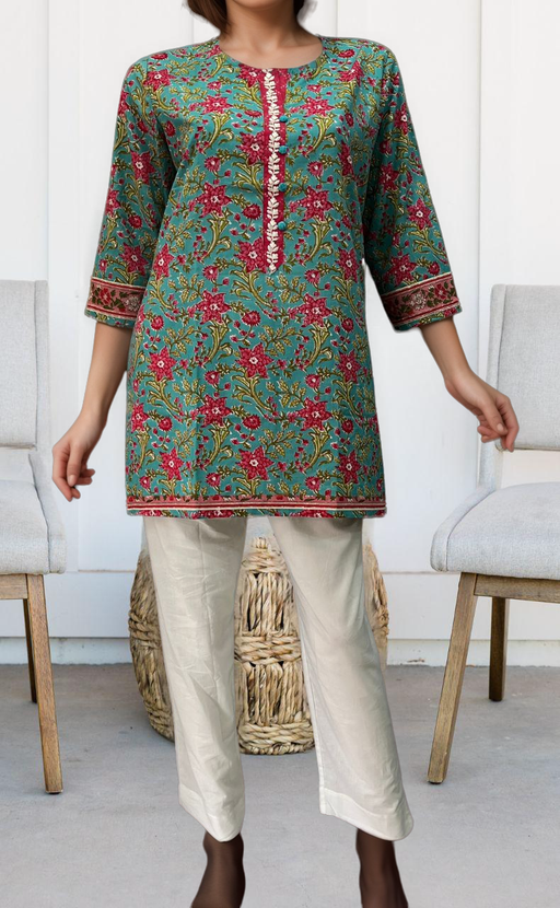 Teal Blue Garden Jaipur Cotton Short Kurti. Pure Versatile Cotton. | Laces and Frills