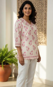 Off White/Pink Flora Jaipur Cotton Short Kurti. Pure Versatile Cotton. | Laces and Frills