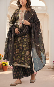 Deep Brown Floral Jaipur Cotton Kurti With Pant And Dupatta Set. Pure Versatile Cotton. | Laces and Frills