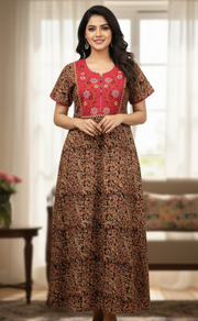 Pink/Maroon Kalamkari Pure Cotton Nighty. Pure Durable Cotton | Laces and Frills