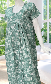 Pista Green Garden Full Open Soft Cotton Nighty. Soft Breathable Fabric | Laces and Frills
