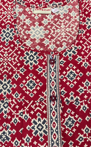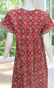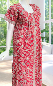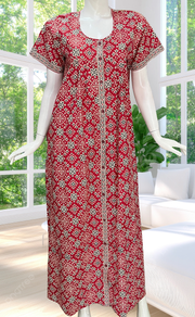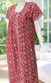 Red Ethnic Print Full Open Pure Cotton Nighty. Pure Cotton | Laces and Frills