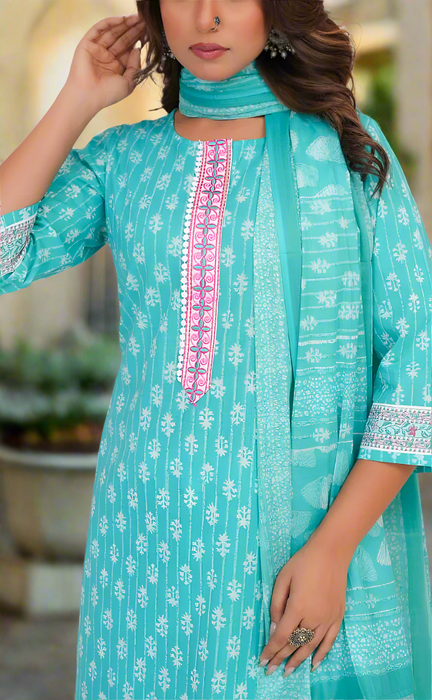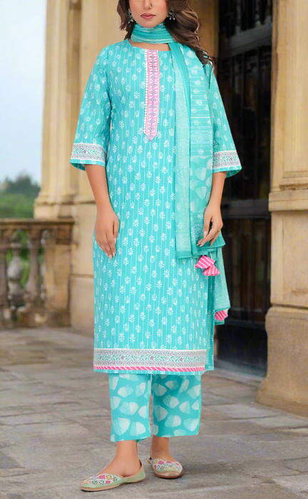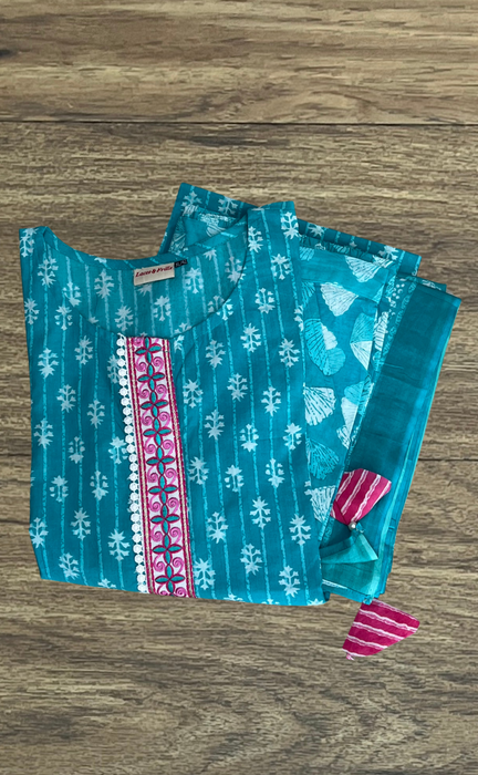 Sea Green Tiny Flora Jaipur Cotton Kurti With Pant And Dupatta Set. Pure Versatile Cotton. | Laces and Frills