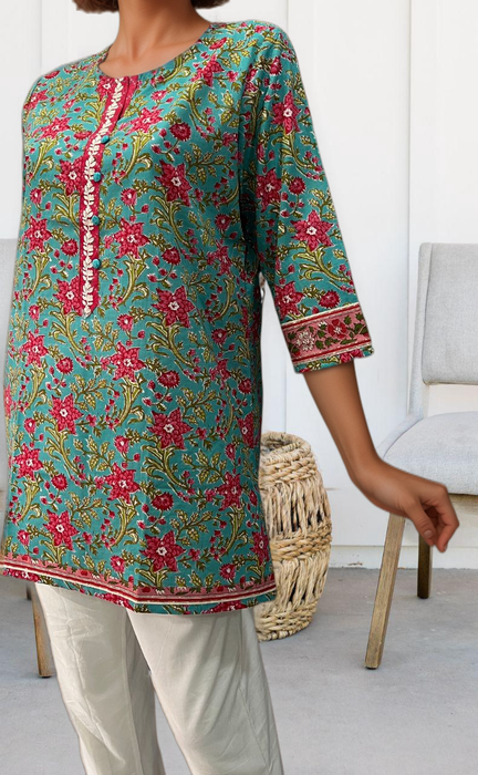 Sky Blue/Pink Jaipuri Cotton Short Kurti. Pure Versatile Cotton. | Laces and Frills