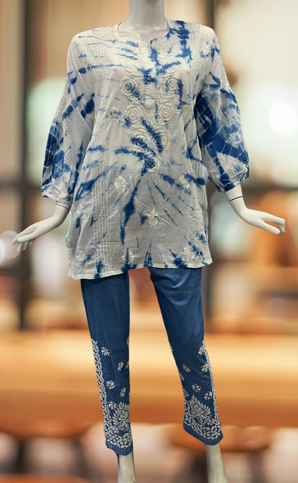 White/Blue Chikankari Short Kurti/Pant Co-Ord Set . Versatile Cotton Fabric. | Laces and Frills