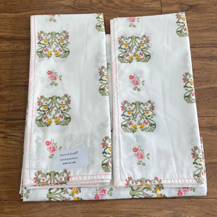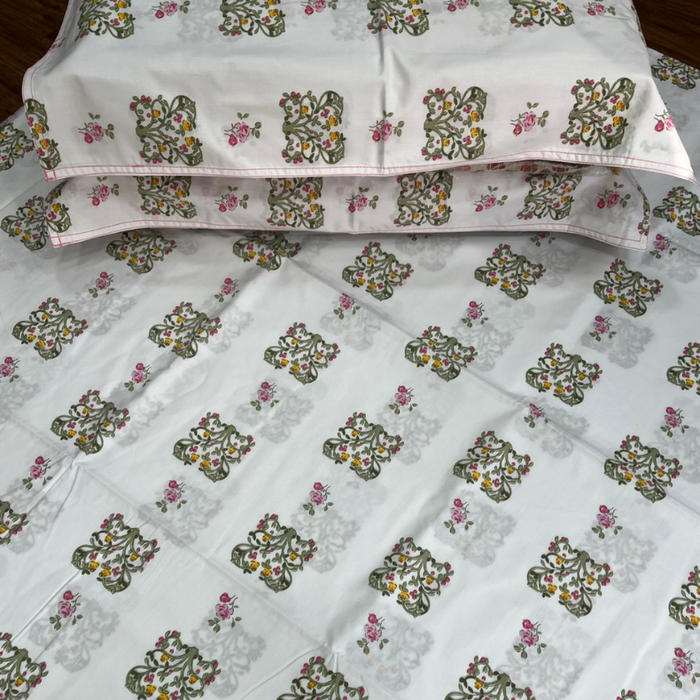 White/Green/Red Floral Double Bedsheet with Pillow Covers/90" x 108"