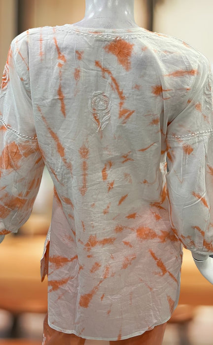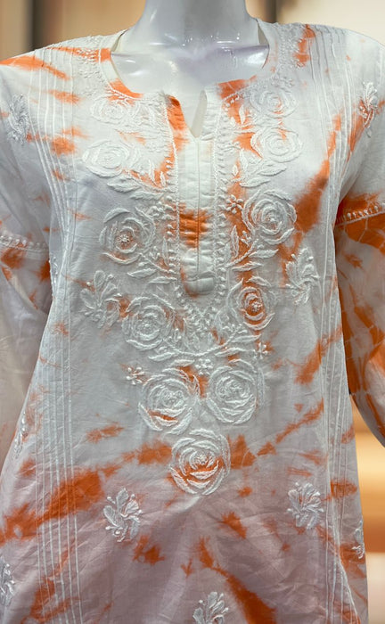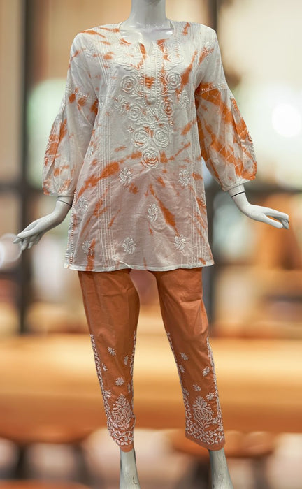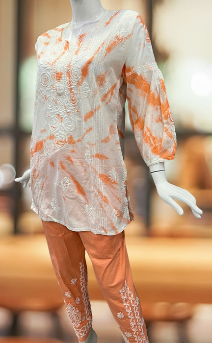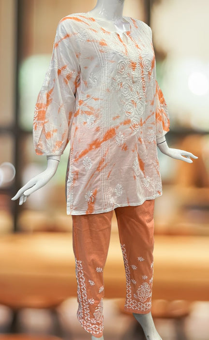 White/Orange Chikankari Short Kurti/Pant Co-Ord Set . Versatile Cotton Fabric. | Laces and Frills