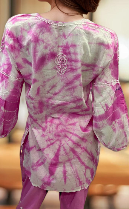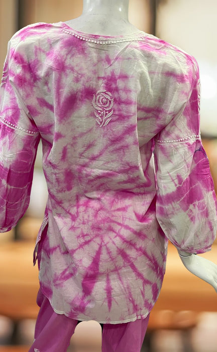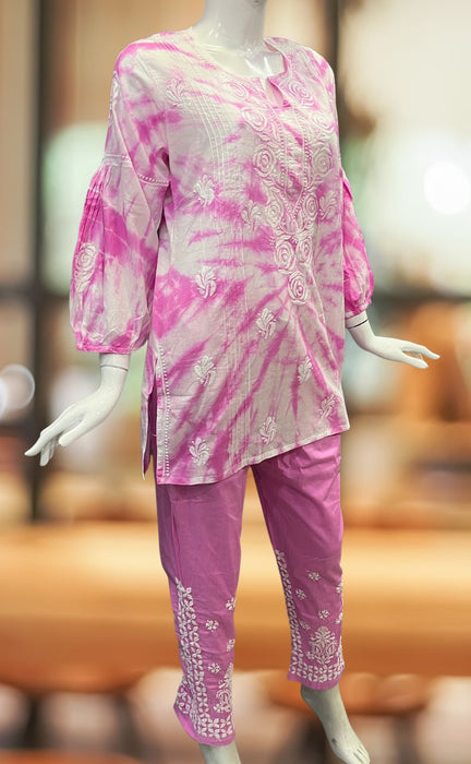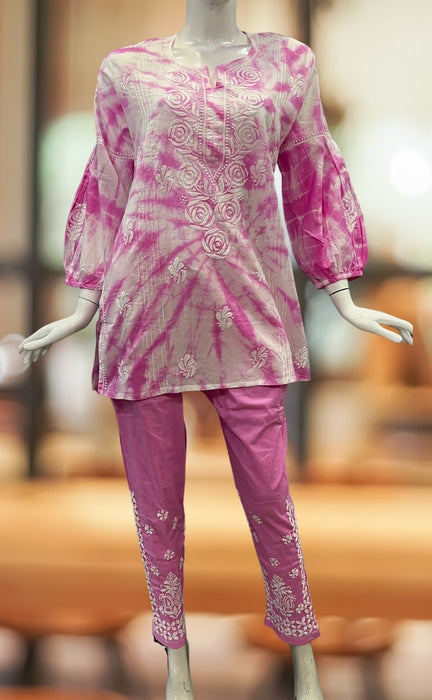 White/Pink Chikankari Short Kurti/Pant Co-Ord Set . Versatile Cotton Fabric. | Laces and Frills