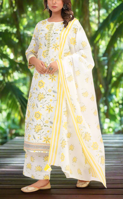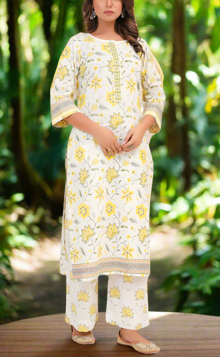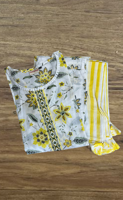 White/Yellow Garden Jaipur Cotton Kurti With Pant And Dupatta Set. Pure Versatile Cotton. | Laces and Frills